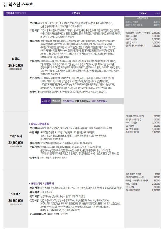 디젤 2.2 2WD 모델의 차량가격은 2594~3666만원입니다. 여기에 취득세 및 부대비용을 더한 출고가는 2717~3838만원입니다. 트림에 따라 가격변차가 1천만원까지도 납니다.
