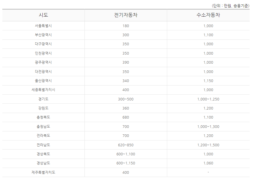 2023년 지자체별 보조금표입니다. 거주 지역에 지자체보조금을 참고하시기 바랍니다. 서울은 180만 원, 경기도는 300~500만 원, 제주도는 400만 원입니다. 가장 많이 지원해 주는 지역은 경상도로 600만 원에서 최대 1150만 원까지 받을 수 있습니다.